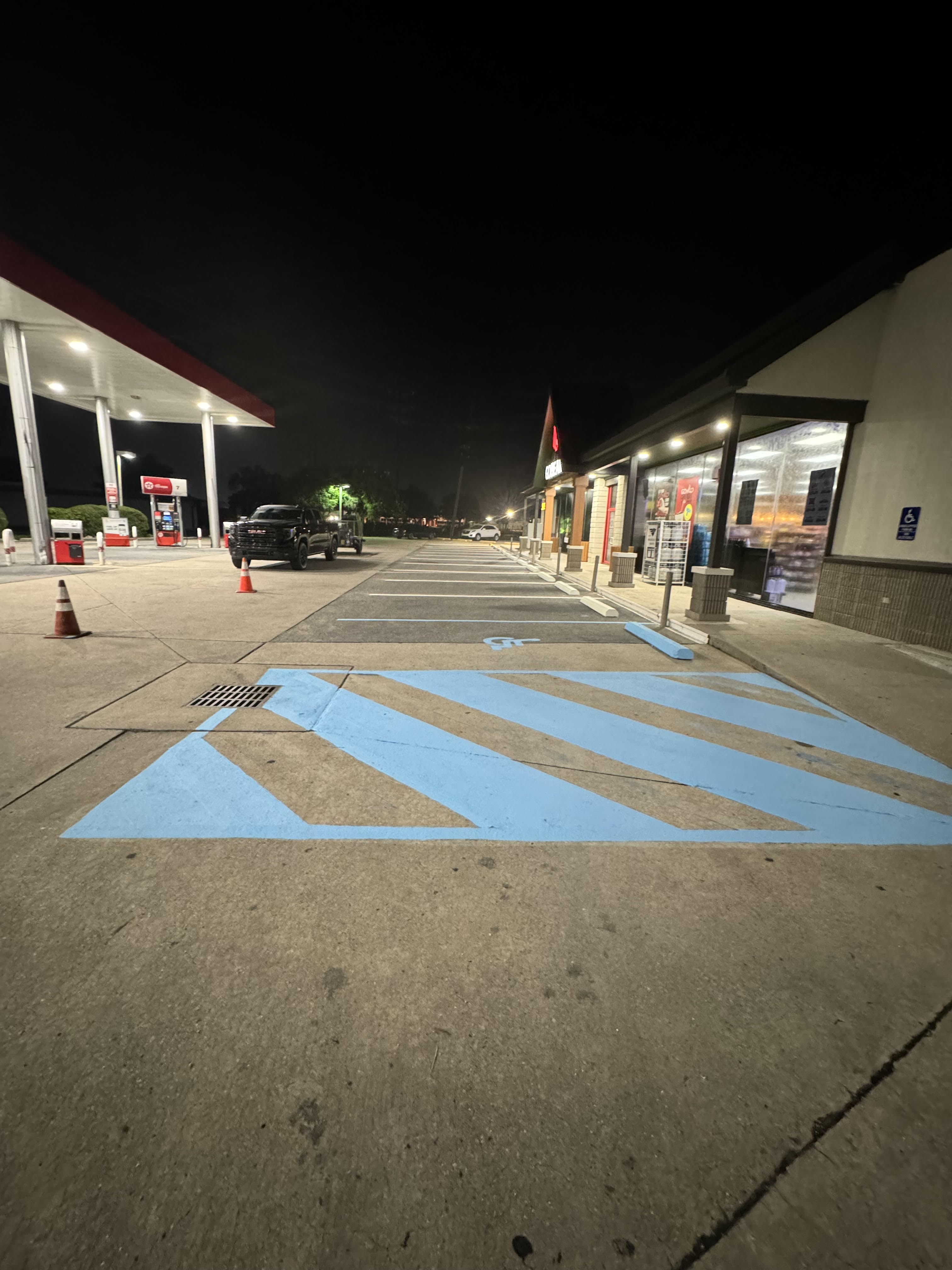 This Gas station in Houma Louisiana was in need of some TLC. We fist Pressure washed concrete. Then the very next night we Restriped the parking lot. Making sure this property was following the new ADA parking lot striping regulations!